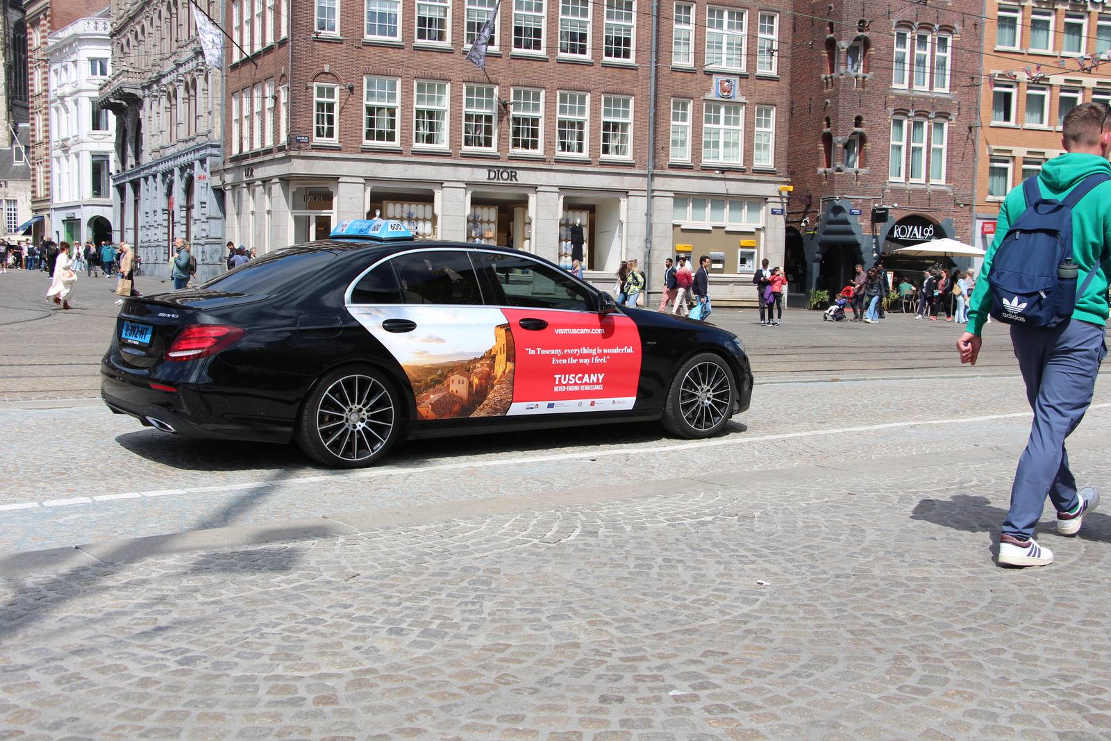 klassische Taxiwerbung als mobile Out-of-Home (OOH)-Werbung, die im urbanen Alltag sichtbar wird.